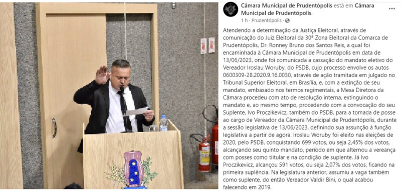 Com a condenação, Woruby perde o mandato que assumiu em 2021, e no seu lugar, assumirá o suplente e agora vereador Ivo Proczkevicz.
