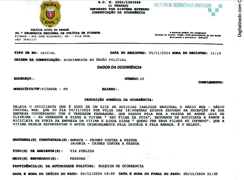 O fato aconteceu no final da tarde de segunda-feira, dia 04 de novembro de 2024, por volta das 18h40min, quando o proprietário do Jornal e Site de Notícias Tabloide Regional e da Rádio Central Web de Pitanga, estava sentado na recepção da referida empresa, conversando com o Vereador Fernandão, o ex-vereador André Luiz de Oliveira, que andava de bicicleta pela calçada, quando passou pela porta da Rádio, chamou o radialista de “filho da puta”, na sequência parou e retornou com a bicicleta e parou na porta da Rádio e disse: “ainda quero ver os teus filhos no inferno”, pedalou e não esperou nenhum tipo de reação aos seus ditos.